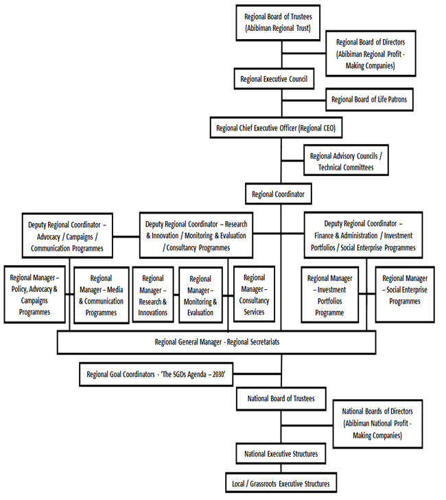 Abibiman Foundation as the Africa Regional Secretariat operate under a structure of the Regional Assembly, Regional Board of Trustees for the Abibiman Africa Regional Trust, Board of Directors of Abibiman Regional Profit-Making Companies, Africa Regional Executive Council, Regional Secretariat, and Country Executives (National and Local Executives).